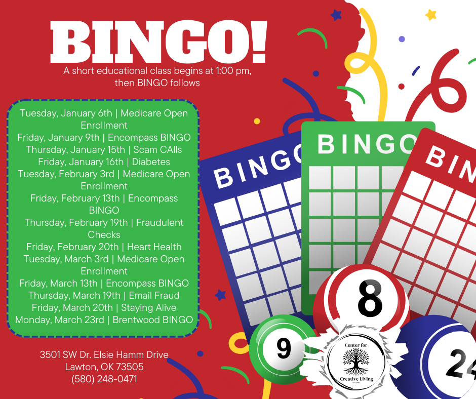 More detailsJoin us for Bingo at the Center for Creative Living! Open to adults 55 and up, Bingo is a fun way to socialize, stay mentally sharp, and enjoy friendly competition with friends—check the link for upcoming dates and details.